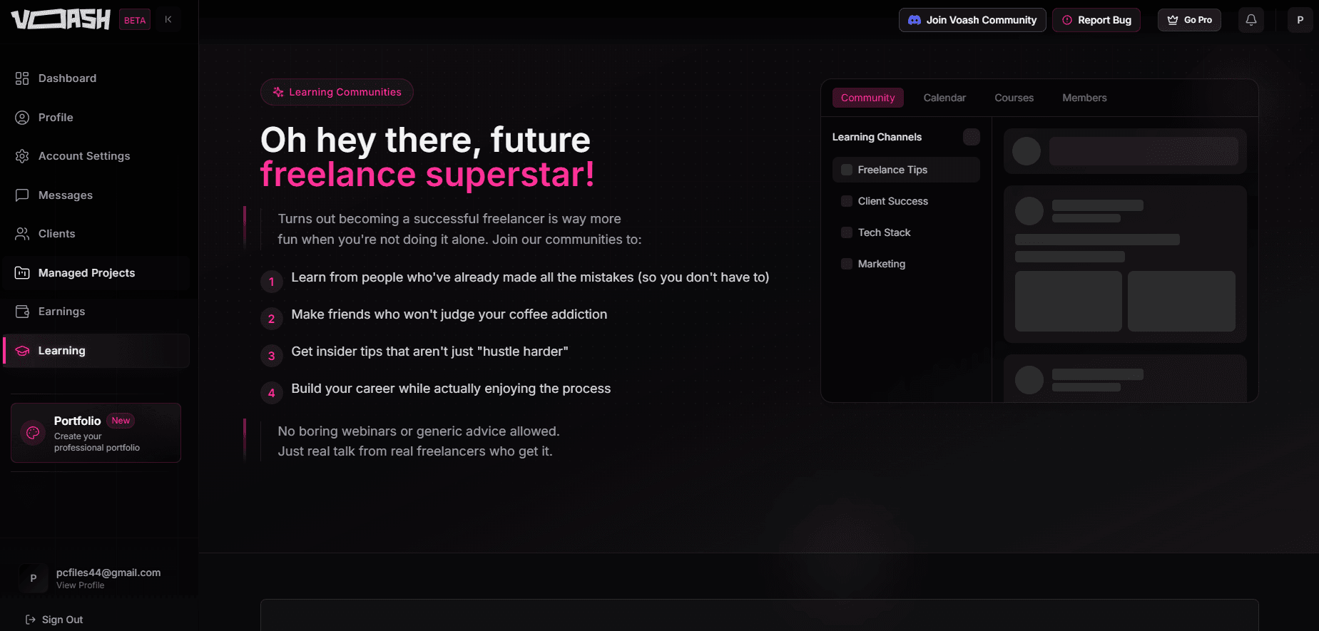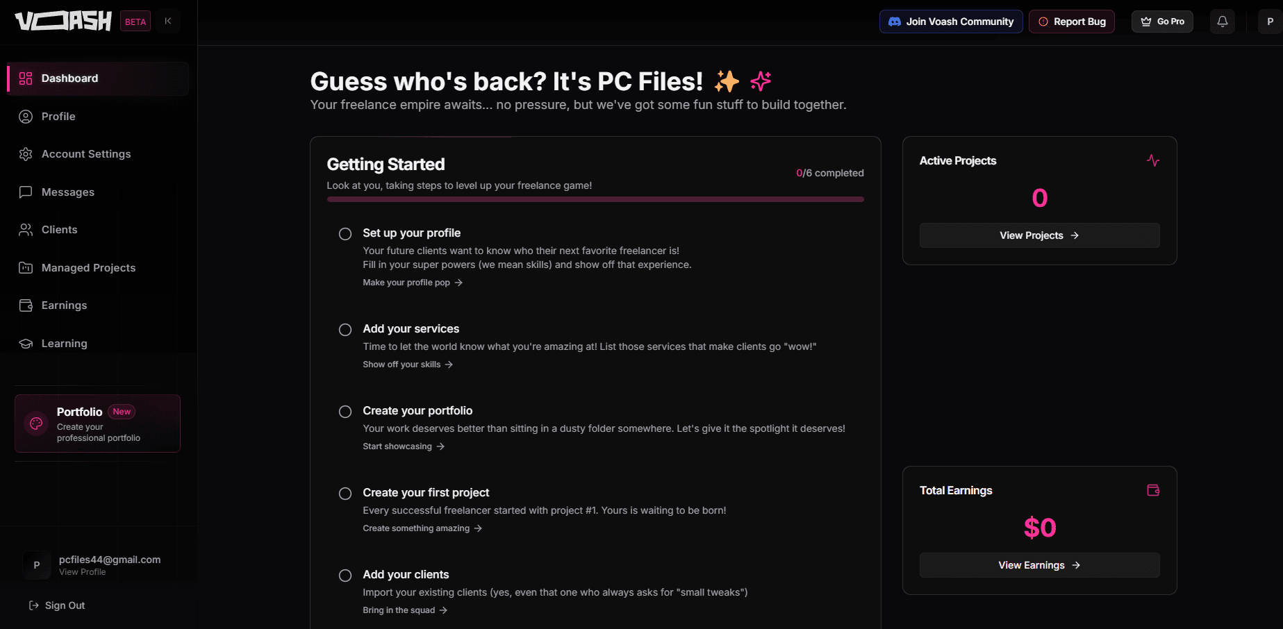 By understanding your skills, goals, and workflow, Voash provides intelligent guidance and tools that adapt to how you work, helping you make better decisions and stay focused as you grow your freelance business.